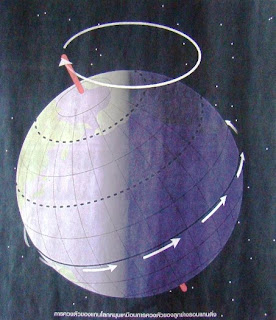 เปรียบเทียบการเอียงของลูกข่างขณะกำลังหมุนตัวเหมือนกับโลกในปัจจุบันที่เอียงทำมุม 23.5 องศา มีหลายๆ คนสงสัยว่าถ้าแกนโลกเอียงไปมากกว่านี้จะเกิดอะไรขึ้นบ้าง อย่างหนึ่งที่เปลี่ยนคือฤดูกาล จากร้อนเป็นหนาว จากหนาวเป็นร้อน นอกจากนั้นอาจทำให้การหมุนตัวของโลกเร็วขึ้น นั่นหมายถึงเวลาจะเร็วขึ้น สิ่งที่ส่งผลทำให้แกนโลกเปลี่ยนไป ได้แก่ การเกิดแผ่นดินไหวที่มีขนาดมากกว่า 10 ริกเตอร์ แต่ไม่ทำให้เปลี่ยนไปมากเท่าไหร่ อีกอย่างคือการควงตัวของโลก เพราะโลกจะควงตัวครบรอบทุกๆ 25,730 ปี ถ้านับจากปัจจุบันไปอีก 12,865 ปี ถึงจะทำให้เกิดการเปลี่ยนฤดูกาลเช่นที่ว่า ต่อจากนั้นอีก 12,865 ปี ถึงจะกลับมาเป็นเช่นเดิม